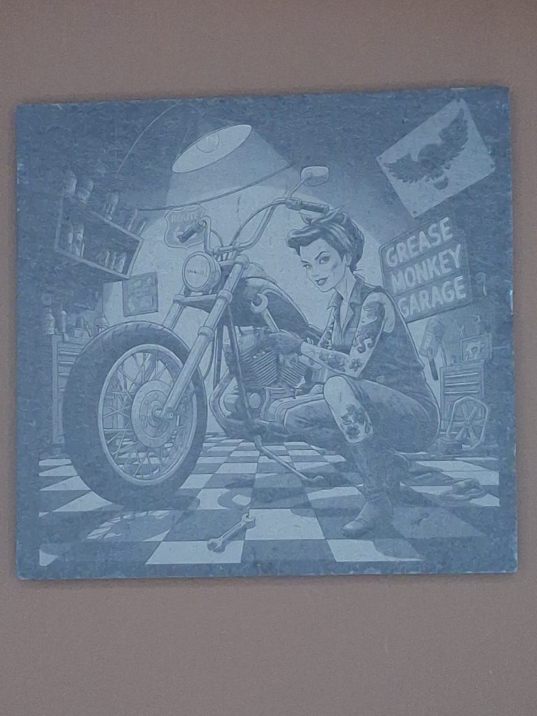 La scène gravée regorge de détails authentiques : la Pin-Up élégamment vêtue dans le pur style des années 50, la moto aux chromes brillants, le panneau emblématique « Grease Monkey Garage », sans oublier le petit singe mécanicien perché sur la moto. Chaque élément participe à créer une ambiance rétro, chaleureuse et pleine de caractère, idéale pour les amateurs de décoration vintage et de culture américaine.