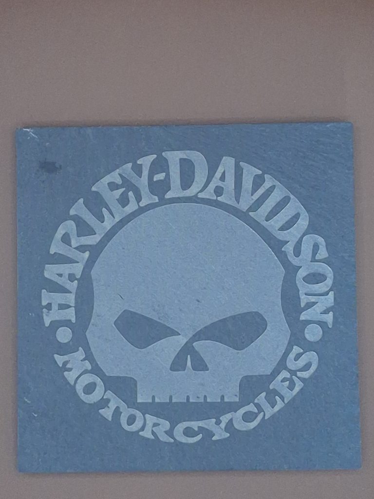 Sous-verre en ardoise naturelle gravé du logo emblématique Harley-Davidson avec tête de mort. Accessoire premium pour motards et collectionneurs.