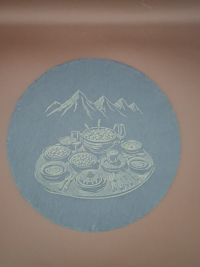Dessous de plat ardoise montagne – Scène culinaire gravée