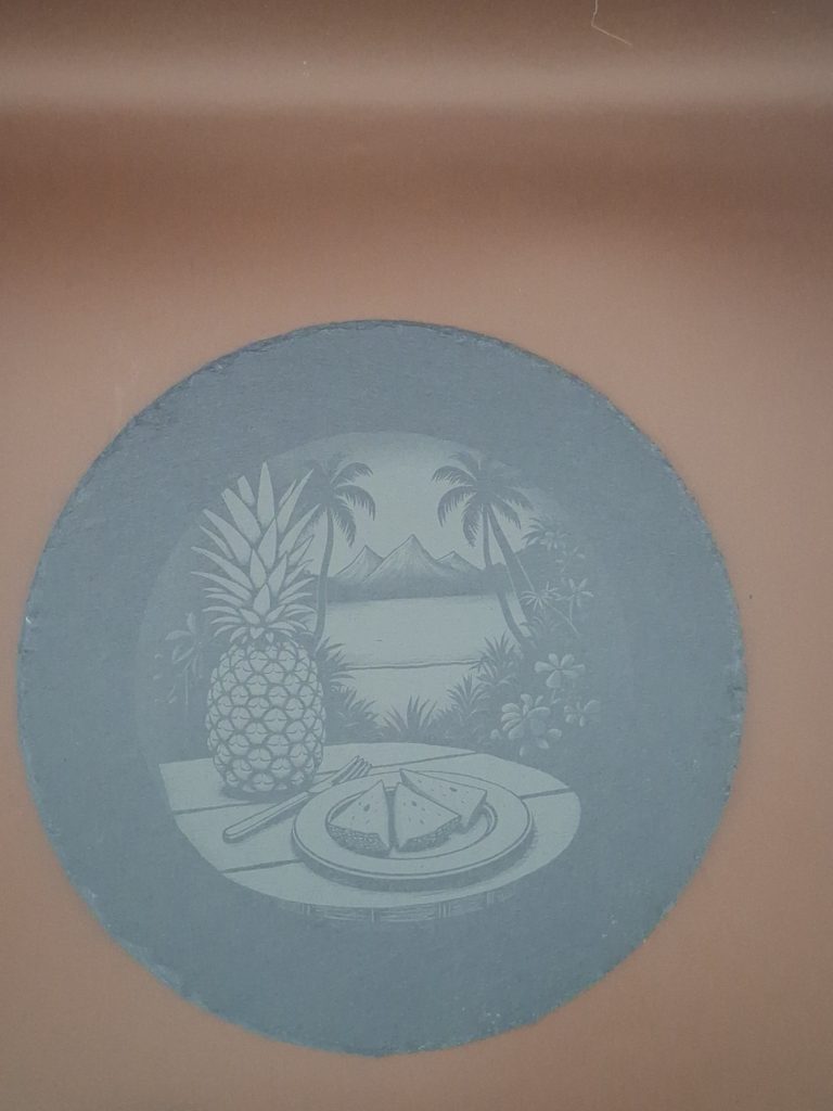 Dessous de plat en ardoise gravé au motif tropical. Design unique et artisanal, parfait pour la table et les cadeaux.